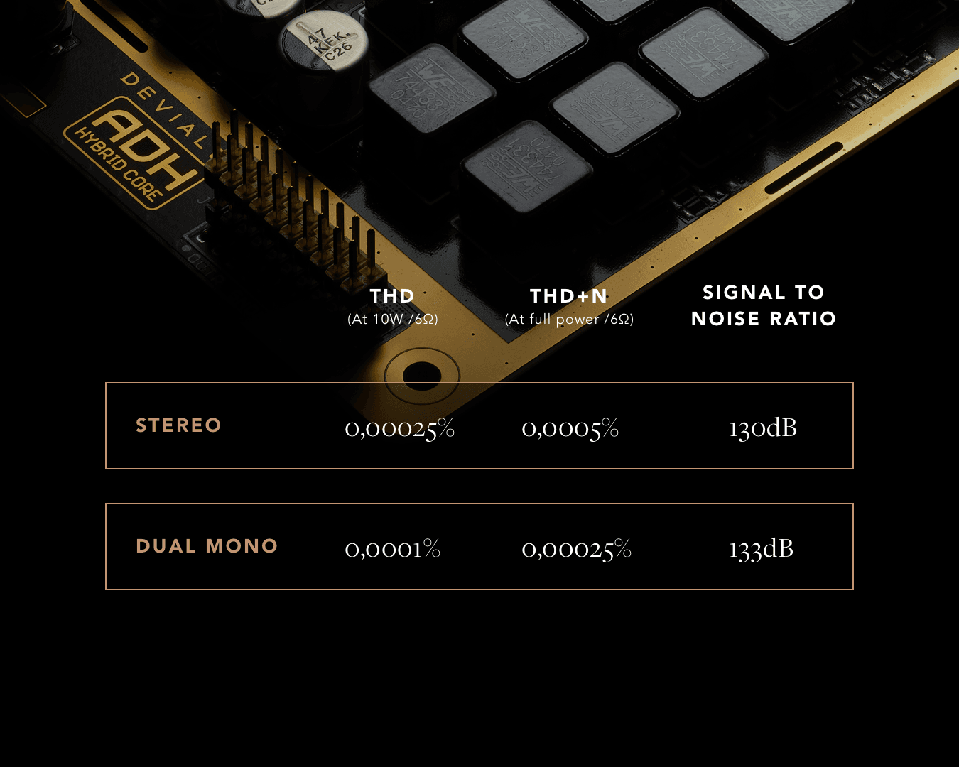 New version of ADH® hybrid amplification, new Class A amplifier with an improved damping factor, new Class D amplifier with optimized efficiency, new Magic Wire® DAC with less harmonic distorsion over the full bandwidth, new more powerful and responsive power supply, integration of the Core Infinity board with reworked clock distribution for minimal digital jitter, ...